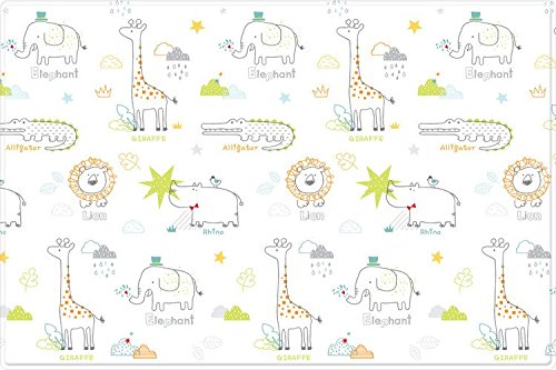 - Double-sided design features zoo animals on one side "modern line" pattern on reverse side.