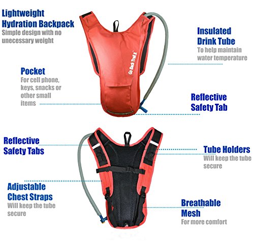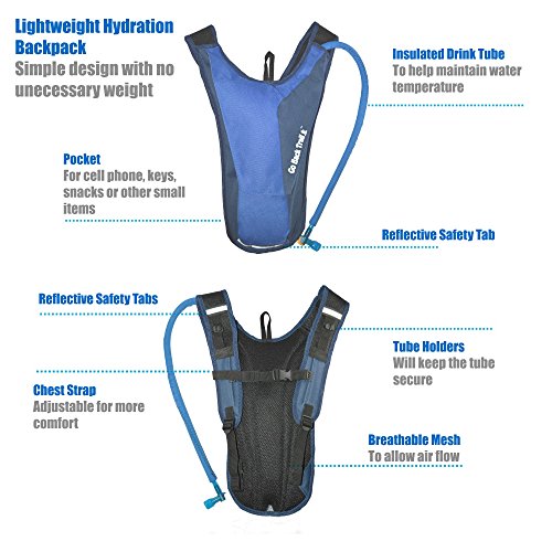 -. Feature : LIGHTWEIGHT: The backpacking hydration with the hydration bladder, hose and bite valve weighs in at 1 pound (excluding water) making your outdoor activities more comfortable and enjoyable. This hydration backpack is great for women, men, teens and even smaller kids. Great hydration backpack for biking, walking and running. / BETTER DRINKING EXPERIENCE: The drinking tube is covered with Neoprene to help maintain constant drinking temperature. The elastic loop and adjustable tube holder are used to keep the tube secure. Go Back Trail outdoor hydration pack uses only the finest TPU 1.5 L bladder to maintain water quality and taste. We also added Velcro to the bladder cover to keep it from flapping while walking or riding a bicycle. / ULTIMATE COMFORT: Keep the pack straps from falling off your shoulders with our adjustable chest strap. To change the strap height, just slide the clips on both sides to your ideal height for a perfect fit and comfort. We also upgraded the strap material to be softer and stronger. / ADVANCED FEATURES THROUGHOUT: Located on the back and on the shoulder straps are light reflecting strips for higher visibility and safety. Also included is an expanded accessory pocket for cell phone, keys, snacks or other small items. Go Back Trail's attention to details also includes an inside strap that is designed to support the weight of a full hydration bladder more evenly and without sagging. / OUR GUARANTEE: We proudly test our products for optimal performance. If you have any issues with our outdoor hydration pack, simply contact us and our highly rated customer service team will gladly assist you. Buy yours today risk free with our 30 day money back guarantee!