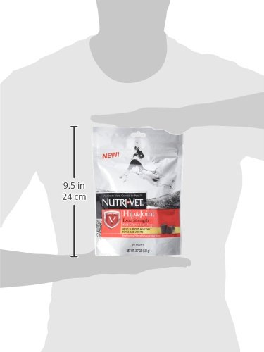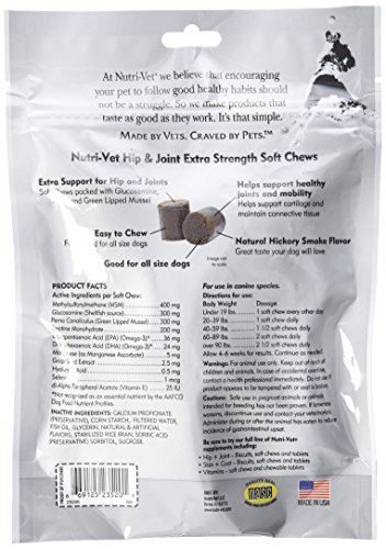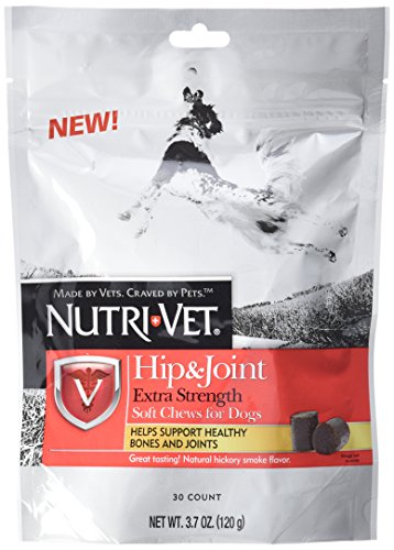 Nutri-Vet hip & joint extra strength soft chews supports healthy joints and mobility with a combination of MSM and glucosamine. Hickory smoke flavor soft chews are delicious and sized for all dogs. Healthy joints are not only important in the ability and willingness of dogs to perform well, but also for comfort in walking, climbing and getting up and down. Joints consist of a joint cavity filled with synovial fluid that serves as both a lubricant and source of nutrition, a joint membrane and articular cartilage that acts as a shock absorber. These components are continually being “rebuilt” to maintain strength and resilience. If any of the building blocks of these components are not available in adequate amounts, stiffness and soreness result - conditions commonly seen in large breeds and active or elderly dogs.Feature