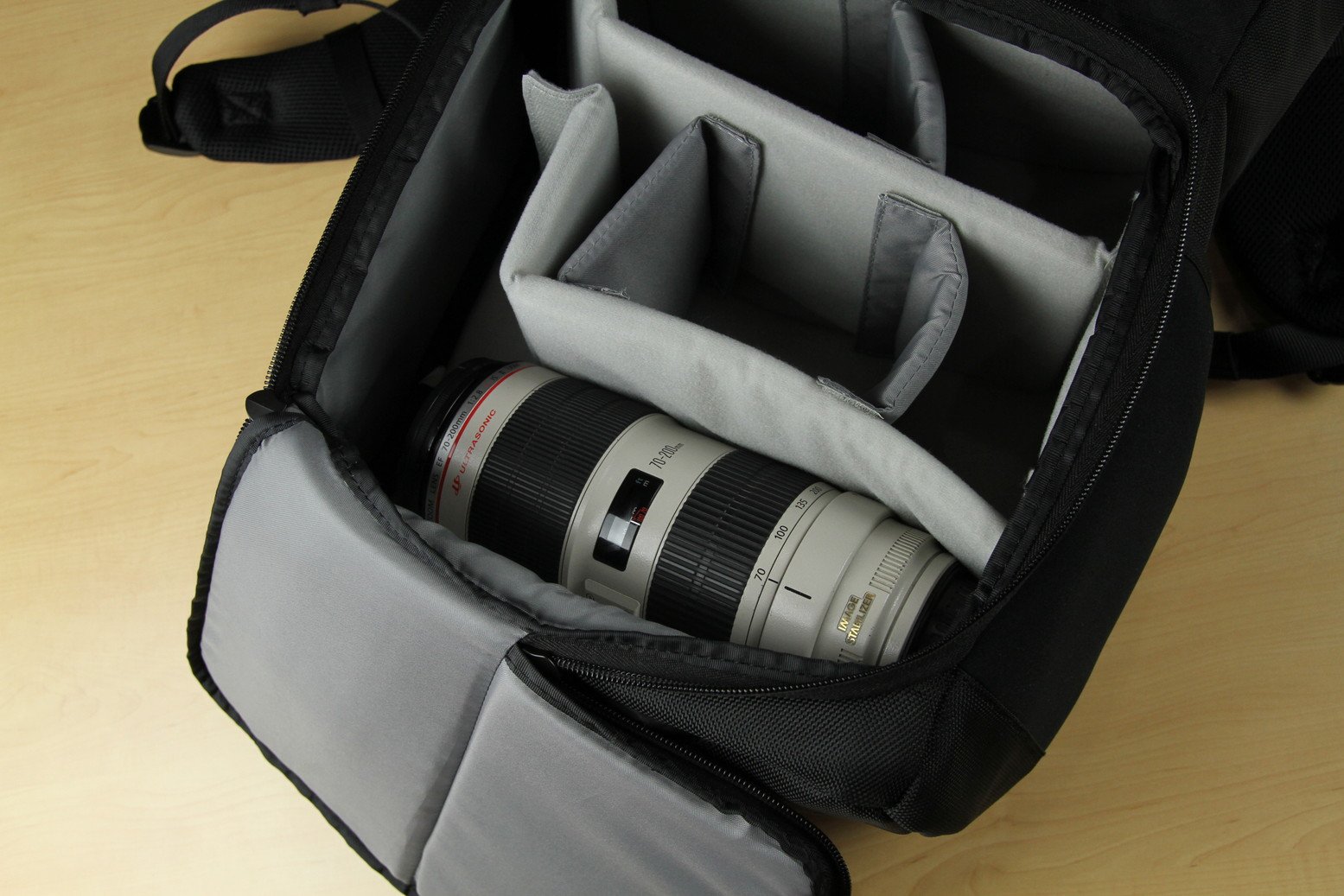 Access to the camera equipment storage section is accessible from two zippers at the side and the front, from the side when you want to take out the camera immediately, from the front when you want to replace the lens on the floor, depending on the application.