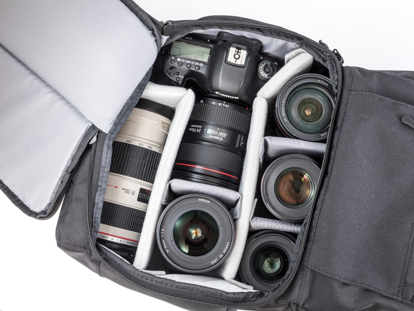 It is possible to store single lens reflex digital camera + standard interchangeable lens + 3 interchangeable lenses + α with standard zoom lens in the storage for camera equipment.
