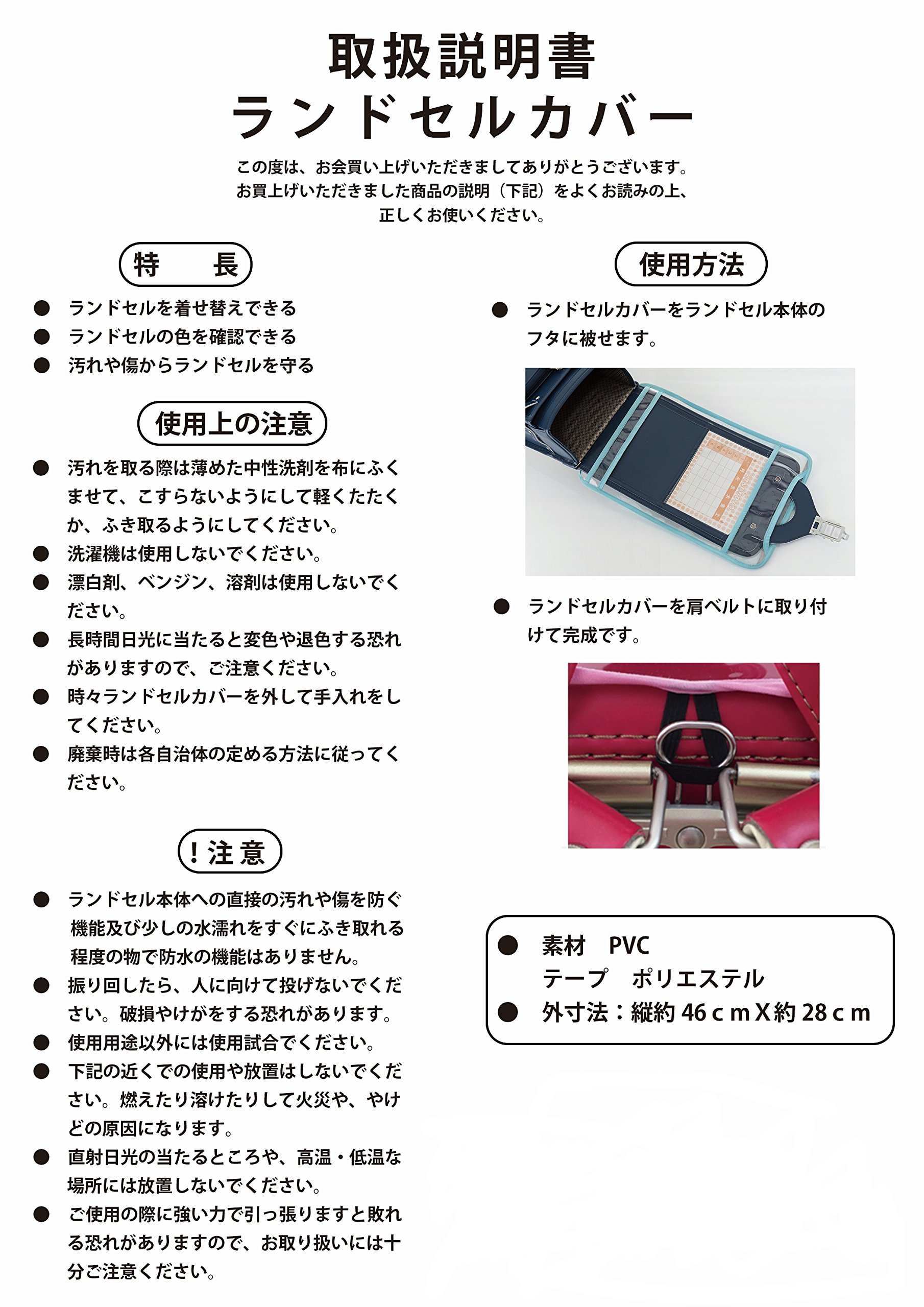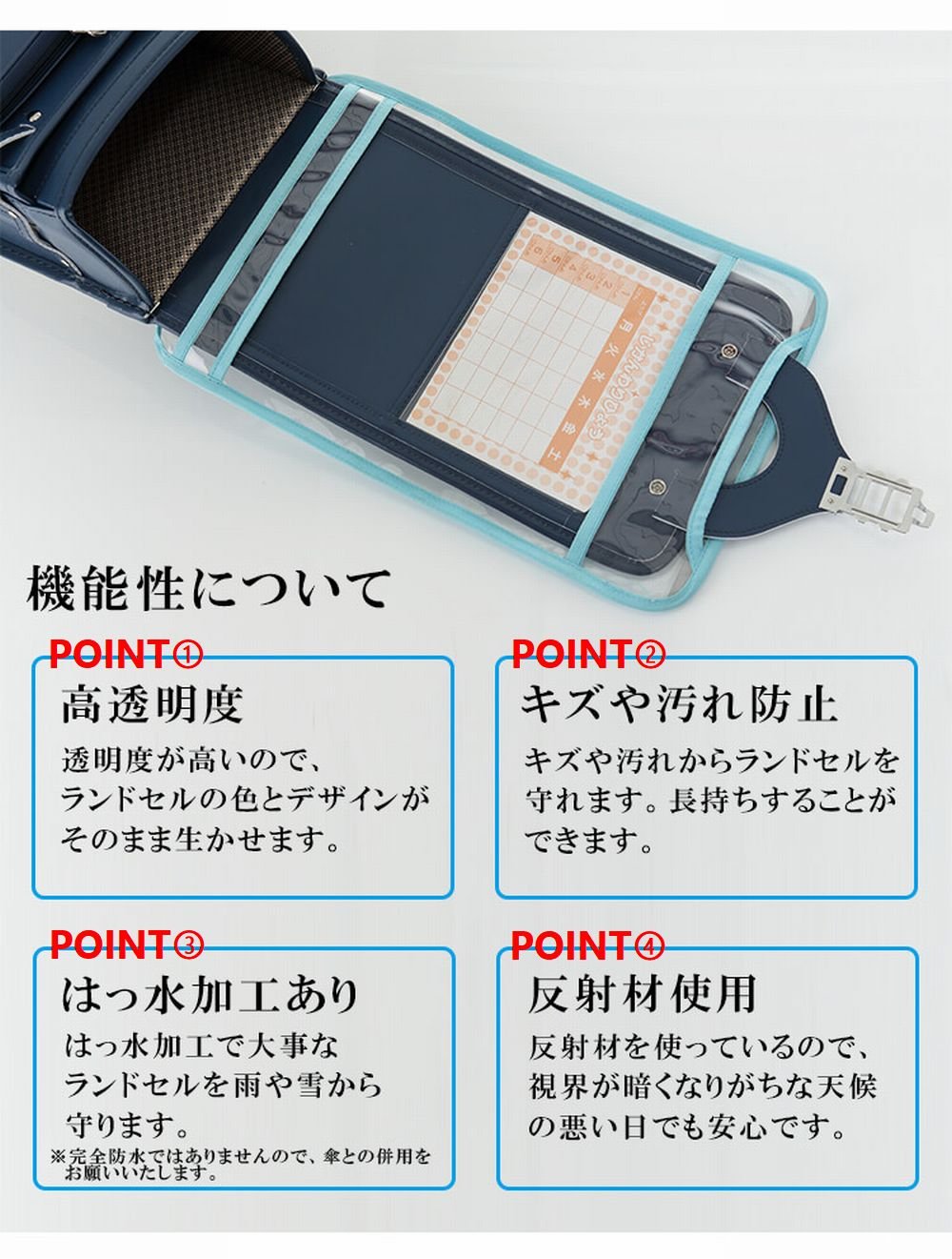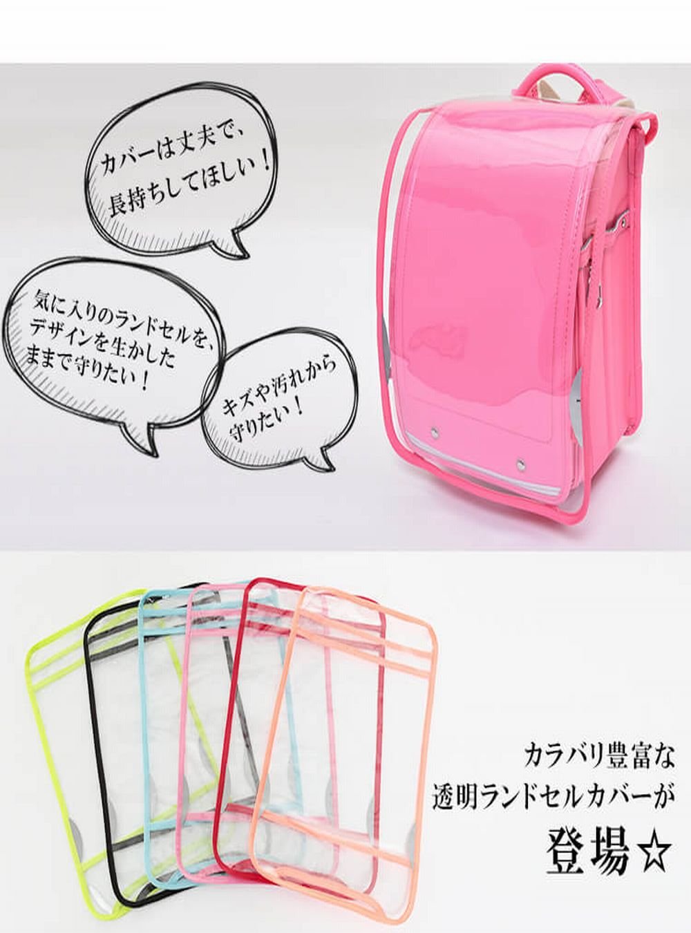 Transparent cover that protects while preserving the design of the school bag with thick transparent sheet with high transparency.