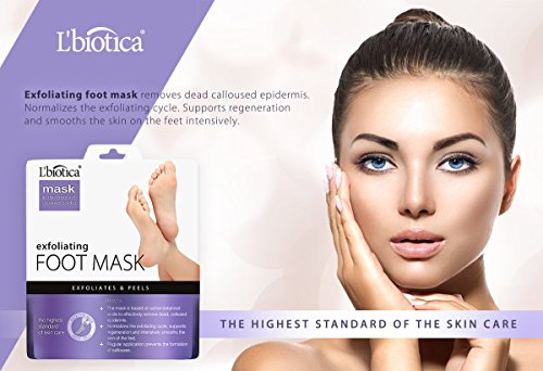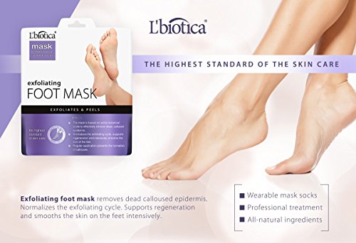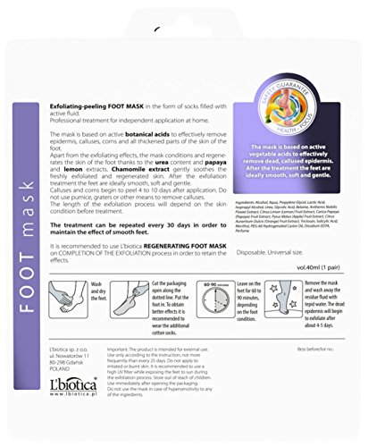 Get soft and smooth Baby Feet with Lbiotica Today. Lbiotica Foot mask is designed to Effectively Remove Epidermis, Calluses, corns and Hardened Skin from Your Feet. ?EASY TO USE and HIGHLY EFFECTIVE HOW TO USE: 1. Clean and dry your feet, Take out foot peel mask from the packaging. 2. Slip on the foot mask, and press the outer layer of the mask so that the walls of foot mask touch the feet. 3. We recommend that you wear normal socks on top of foot mask for best results and your walking convenience. 4. About 60-90 minutes later, remove the foot masks and wash the residue fluid out before wiping out with a dry towel. 5. Apply foot lotion to keep the feet moist and smooth.? RESULT: 1. 4-10 days later, the dead skin layers will gradually start to fall off. We recommend that you soak your feet into warm water to help dead skin to exfoliate. 2. About 1-2 weeks later, all the dead skin layers will completely fall off, leaving a smooth and soft baby feet.? 3. Good care and nourishment is needed for your whole new baby skin. 4. Use once a month for better result. 5. Results may vary individually. CAUTION:? 1. For external use only. 2. Do not use this product, if you are pregnant or nursing.? 3. Do not apply to irritated or damaged skin. 4. Do not use more than once a month. 5. If skin irritation occurs, stop use. 6. Keep out of reach of children.? 7. Store in a cool dry place.? ?