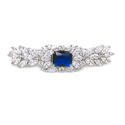 Made of rhodium plated brass, this fancy hair barrette clip is featuring a cluster of marquise shaped CZ with rectangular red CZ as centerpiece. Measures about 2.25" long, this hair barrette will complete your look with subtlety.Feature