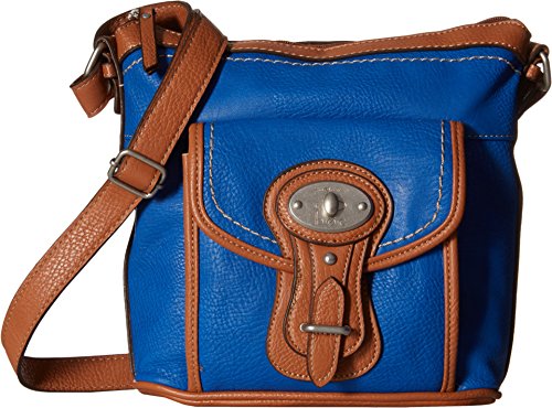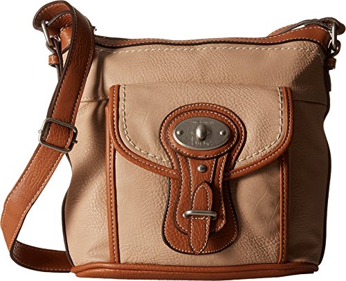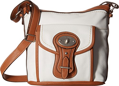Top zip closure. Adjustable crossbody strap with antique hardware detail. Exterior features slip pocket and brand hardware at front, zip pocket at back, antique hardware, and contrast stitching. Flat bottom with brand embossed markings. Fully lined interior. Interior boasts back wall zip pocket, brand logo patch, and two slip pockets for organization. Imported.