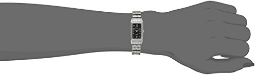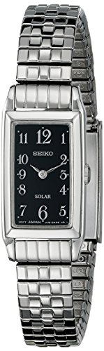 Rectangular stainless steel watch with solar-powered black dial featuring silver-tone indices
