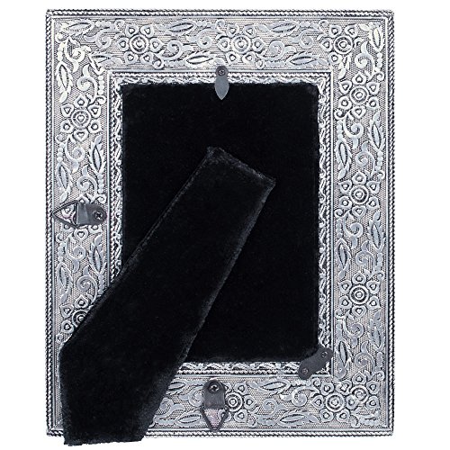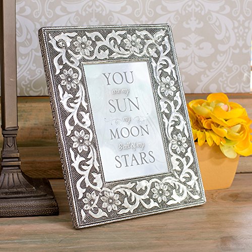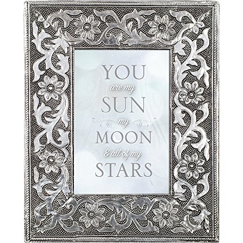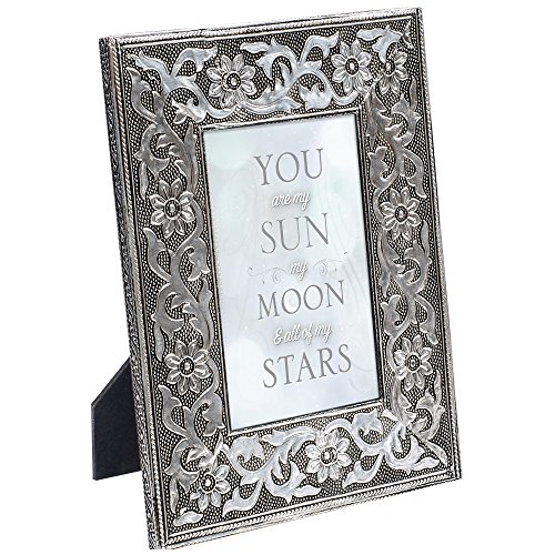 -. Binding : Kitchen -. Brand : Cottage Garden -. Color : Silver -. EAN : 0633303290863 -. Feature : Hand-crafted artisan stamped metal / Detailed, intricate floral design / Frame measures 8 x 10 inches, holds a 4 x 6 inch photo / Includes a wall hanger and an easel on the back to display anywhere in the home / Includes beautiful artwork that can be replaced with a personal picture -. IsAutographed : 0 -. Label : Cottage Garden -. Manufacturer : Cottage Garden -. PackageQuantity : 1 -. ProductGroup : Home -. ProductTypeName : HOME -. Publisher : Cottage Garden -. Size : 8 x 10, Holds 4 x 6 -. Studio : Cottage Garden -. Title : You are My Sun and Moon Silver Color Stamped Metal Artisan 8 x 10 Wall/Tabletop Frame -. UPC : 633303290863