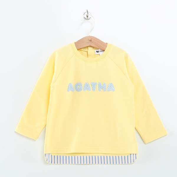 밑단에 스트라이프가 배색 포인트로 들어간 부클 자수 맨투맨 티셔츠입니다.