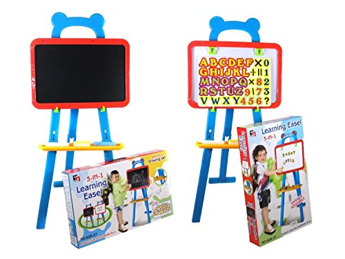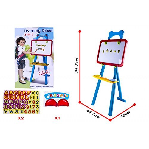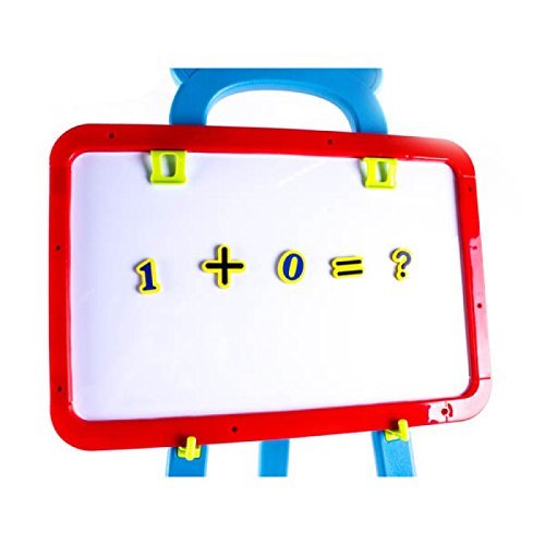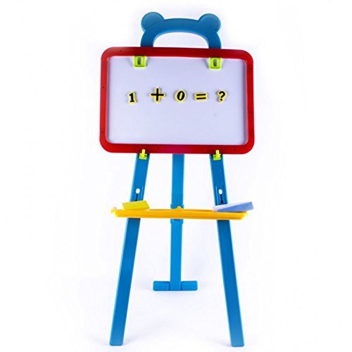 Amazing Learning Easel with quick flip double sided boards; Black board and magnetic board 2 in 1 The design of our boards for learning activities focuses on creating a comfortable and entertaining experience that helps to develop knowledge and skills at an early age. Allow your little ones be creative with this magnificent SET! This Easel is very easy to assemble and put into place, lightweight material, very easy to carry around and to clean. It will hold the board in a safe and perfect place for your kid to enjoy hours of entertainment. Please be aware that in addition, the board can be placed and removed off the easel. So easy to swop from side to side! Use the big chalks on the blackboard to draw and write whatever you want. You can use the little sponge to clean the board and keep it tidy after you have used it. If you actually want to draw something on paper, turn the board and you will find two clips on the top of the white board, these hooks will hold your paper sheet in place so you can write and draw more comfortable. Fancy playing with magnets? This set includes a total of 84 magnets of letters, numbers and math symbols. So much to learn!! This easel 2in1 boards set is perfect for learning activities and artistic activities; improve spelling, calligraphy, reading, drawing and painting. This is without doubt, one of the best companions for a little learner. Set includes: 1x Easel. 1x Shelve. 1x Boards two in one (black and white). 2x Chalks (1x blue, 1x white). 1x Little sponge. 2x Magnet sheets (84 magnets in total). 2x Hooks (to hold board). 1x Stickers sheet. Easel measures: high 94cm x 44cm x 38cm (see pictures for more detail) PLEASE CHECK SIZES BEFORE PURCHASE Recommended age: from 3 years old. More Learning Activity Sets available at deAO 0 |