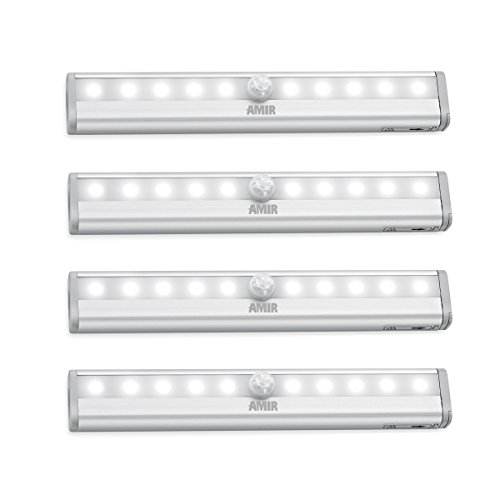 AMIR 10 LED Motion Sensing Closet Lights, DIY Stick-on Anywhere Portable 10-LED Wireless Cabinet Night/ Stairs Light Bar with Magnetic Strip , Puck Lights (Battery Operated - 4 Pack )