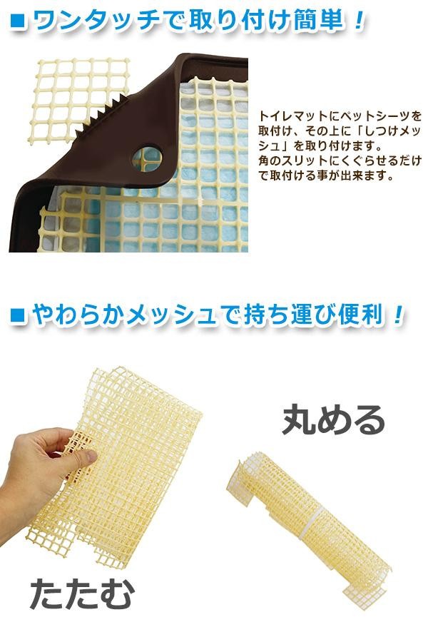 ペットシーツを固定し、ズレ・めくれにくくするメッシュです。シーツの噛みちぎり、引っかき等のイタズラや誤飲の対策にもなります。やわらかい素材ですので、折りたたんで持ち運びでき、丸洗いもOK!! |