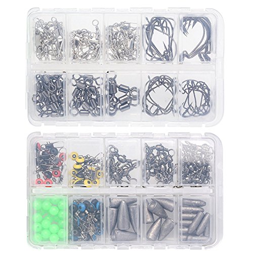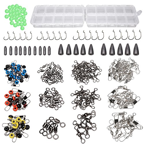 The fishing tackle box set comes with all the necessary fishing accessories 241PCS,fishing hooks,bullet weights sinker,barrel swivel with safty snap connector,rolling barrel fishing swivels,three way cross-line fishing swivels,fishing line to hook swivels shank clip connector and fishing beads.