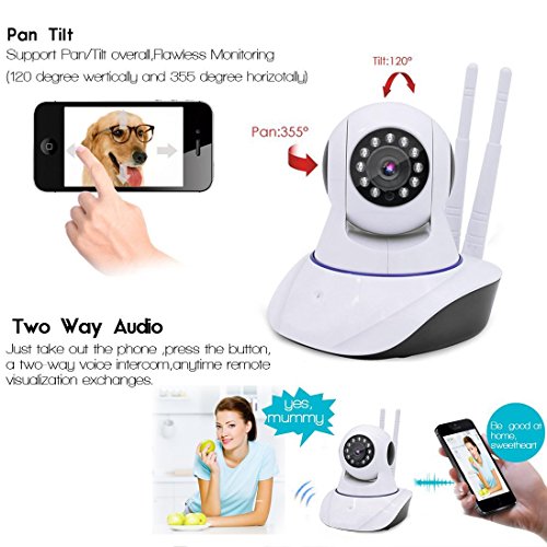 -. Feature : (1)Support for mobile video: Alarm capture images, two-way voice intercom, remote computer、Mobile phone and camera intercom, voice monitor, without having to spend the shell, without the domain name. / (2)Support PTZ control: Built-in RS485 control, the level of 355 degrees, 120 degrees vertical and better monitoring of each blind spot. (1,000,000 pixels). Supports a variety of languages:IOS / Android: Chinese English French Korean Russian Spanish and other languages. / (3)Support rate setting: picture transmission rate can be set to 1-25 frames per second range; Support infrared night vision: 0.3 LUX low illumination 11 LED lights 10 meters infrared night vision. / (4) Centralized platform to watch: centralized monitoring software is a professional video surveillance software that supports video recording, support multi-channel simultaneous camera screen, can support up to 64 images at the same time to watch. / (5)Support Motion detection: can send Email through sensitivity control and FTP upload the incident video and alarm. Support wireless:Wireless is needed in conjunction with a wireless router via wireless transmission, without pulling the network cable is convenient and do not affect the room beautiful (camera and wireless router open distance of about 50 meters)