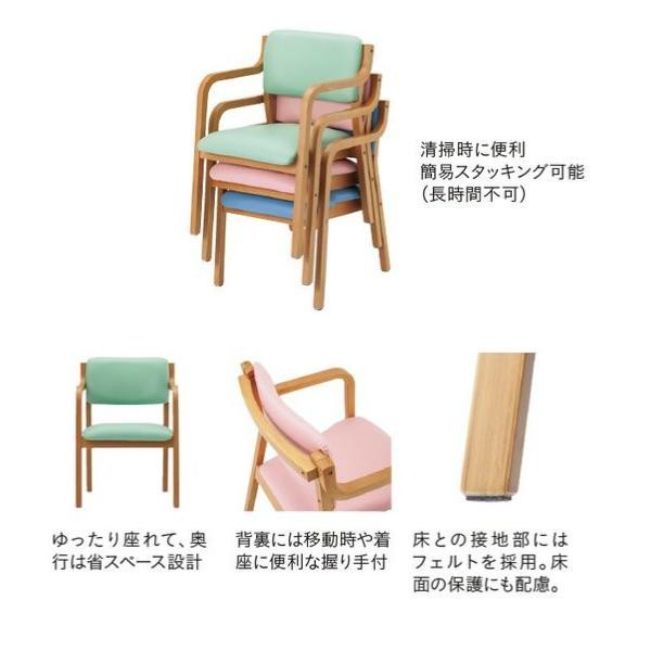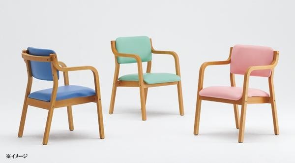 | イスの移動やテーブルでの着座時に便利な握り手付の木製チェアです。脚にフェルトを採用し、床面の保護にも配慮しています。 |