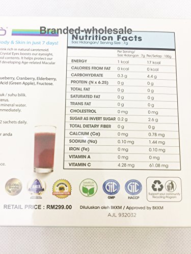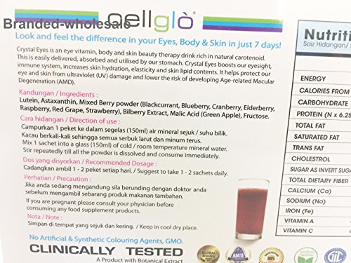 Studio : Olicell Publisher : Olicell Binding : Health and Beauty Product Description Cellglo Crystal Eyes consists of two (2) main botanical Carotenoid ingredients, LUTEIN and ASTAXANTHIN together with other nine (9) types of wild berries and natural fruits. Cellglo Crystal Eyes is formulated by renown bio-chemist from France who has discovered that this formula can inhibit the damaging effects of oxidative UV blue light stress that can eventually lead to Dryness, Astigmatism, Lazy Eyes (Amblyopia), Shortsightedness (Myopia), Presbyopia, Detached or Torn Retina, Night Blindness. Cellglo Crystal Eyes LUTEIN is found in marigold flower petals from Switzerland which helps protect your eyes, helps blocking UV damage on eye and skin and improves overall visual function. Cellglo Crystal Eyes Astaxanthin is a deep red-coloured phytonutrient microalgae called Haematococcus Pluvialis marine algae from Hawaii Island and is the first plant to appear on this planet. Over 500 scientific studies have been conducted in this gem of nature. Astaxanthin can handle different type of free radicals as well as multiple free radicals simultaneously. It is revered as the most powerful antioxidant ever discovered to date. Direction of Use: mix 1 sachet into a glass (150ml) of cold/ room temperature water. Stir till all the powder is dissolved and consume immediately. Recommended Dosage: suggest to take 1 sachet daily. Precaution: if you are pregnant or breastfeeding please consult your physician before consuming any food supplement products. Ingredients: Lutein, Astaxanthin, mixed berry powder (blackcurrant, blueberry, cranberry, elderberry, raspberry, red grape, strawberry), bilberry extract, malic acid (green apple), fructose. 0