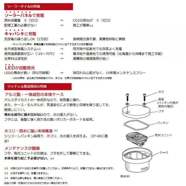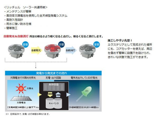●<リッチェル ソーラー共通特徴>①メンテナンスが簡単②高効率太陽電池を使用した全天候型発電システム③高耐久性設計④雨水に強い防水仕様⑤簡単施工