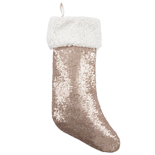 SARO LIFESTYLE Paillette Collection Glittery Sequin with Sherpa Cuff Holiday Stocking, 10" x 18", Champagne