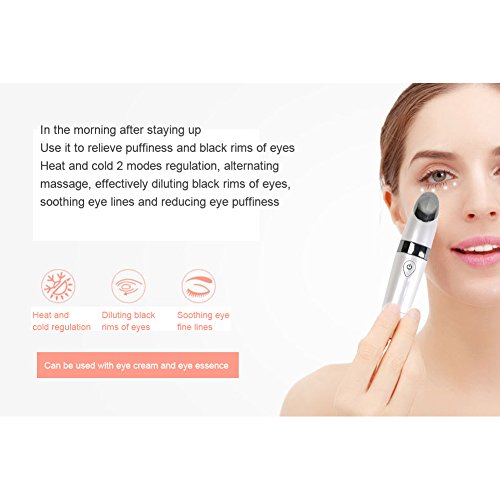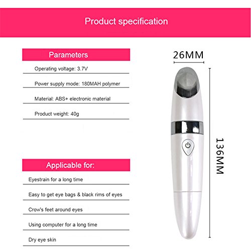 Micro-vibration stimulates crow's feet and eyelid laxity which can achieve a firming effect. Heated treatment stimulates skin cells through massage, locks in moisture, improves blood circulation and revives eyes fatigue. Relieves dark circles and puffiness, removes eye bags and reduces wrinkles around eyes. Negative ion makes skin care product maximize absorption. How to Use: Please insert AAA battery in the correct polarity before use.Clean the eye area and gently apply a thin layer of eye care essence on the eye area.Hold the conductive bar before massaging with the massaging tip point by point or circularly over eye area where eye care essence has been applied. Note: Please make sure the area is clean and fully moisturized, or the massager may not work properly. Massage the area for 8-10 minutes. Use it in the morning and evening. NOTE: To prevent short circuit, please wipe the whole massager with a towel or tissue after use.Package does not include batteries.Micro vibration micro current improve the skin around eyes, making eye skin glossy, removing facial rough skin, fading fine lines and crow's feet. 0 |