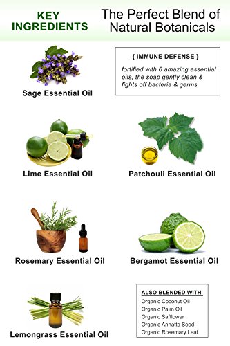 - “IMMUNE DEFENSE” is packed with six of nature’s powerful essential oils (lemongrass, patchouli, rosemary, lime, sage & bergamot). Gently cleanse your skin using the most powerful antibacterial, antiviral properties found in nature!