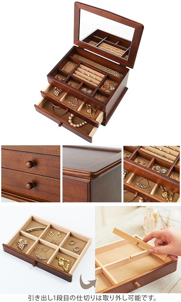 | 日本の職人さんがひとつひとつ丁寧に作った 長く愛用できる木目の美しいジュエルケースです 様々なアクセサリーを収納できる充実した収納スペース 底部はベージュの布張りで高級感があります フタ裏にはコーディネートに便利な大きなミラーが付いています |