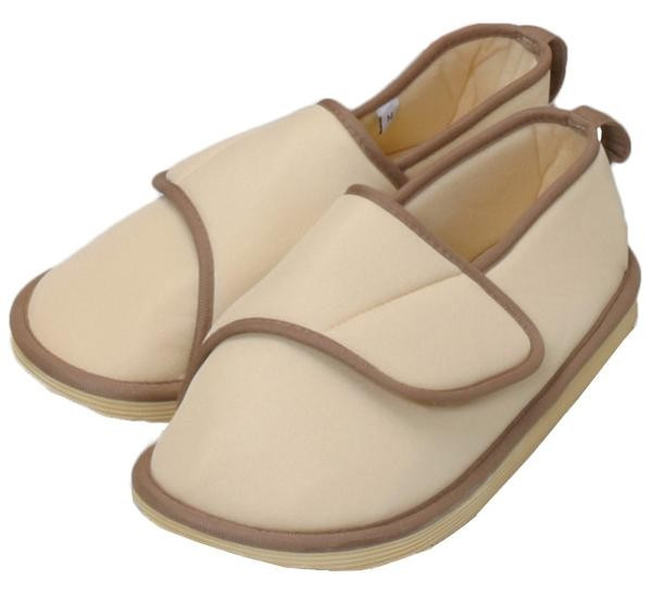 | シューズ型なので、スリッパのように脱げて転倒することを予防します。甲の部分は面ファスナーで調節出来るので、足にフィット。底面はすべりにくい素材と3箇所に滑り止めを付けて、スリップを予防します。歩行中、床に引っかからないように爪先の底を斜めにカットしています。 |