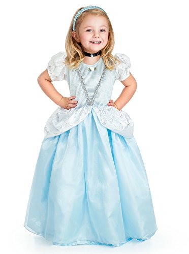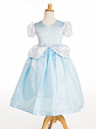 A dress made for the ball. The sky blue crushed velvet bodice is adorned with beautiful silver trim, and the china silk skirt is overlaid with sparkly organza. The sleeves and hip drapes are a soft silver fabric that shimmers at the stroke of midnight. The bodice is stretchy to help accommodate most body sizes. Little Adventures is not affiliated with Disney. Accessories Sold Separately. Available in sizes Small (1-3 Yrs), Medium (3-5 Yrs), Large (5-7 Yrs), and X-Large (7-9 Yrs).Feature