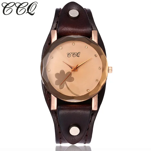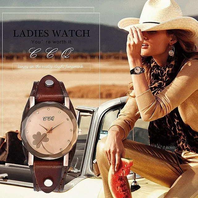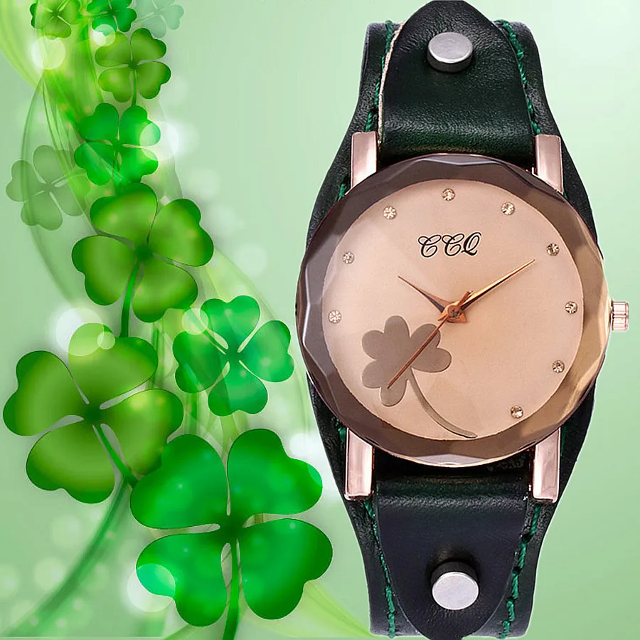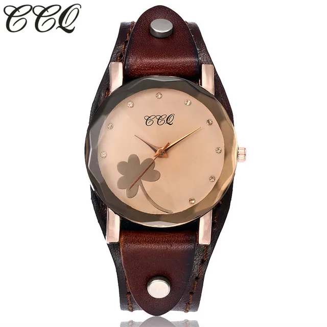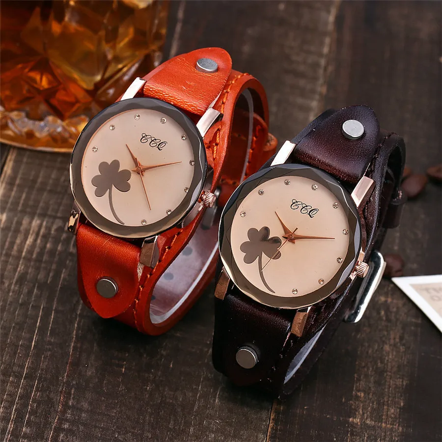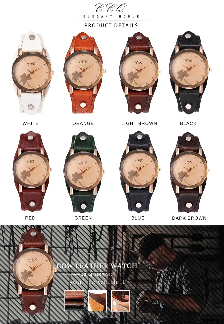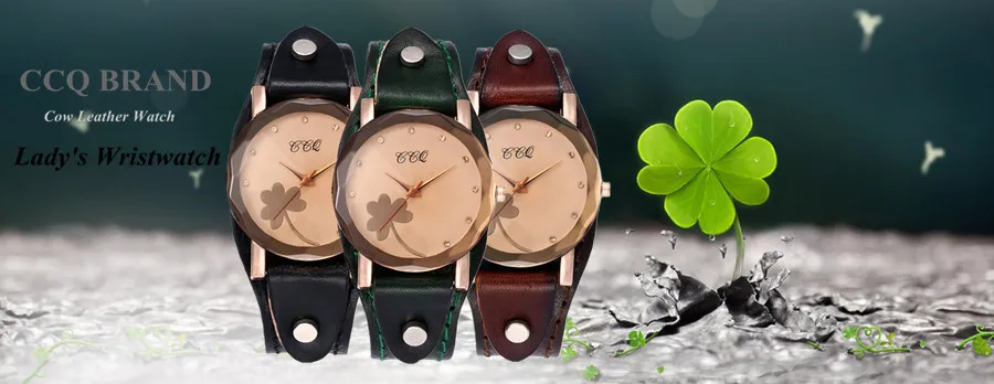 | [해외] 새로운 CCQ 브랜드 빈티지 소 가죽 클로버 팔찌 시계 여성 캐주얼 가죽 석영 손목 시계 선물 시계 Montre 팜므 |