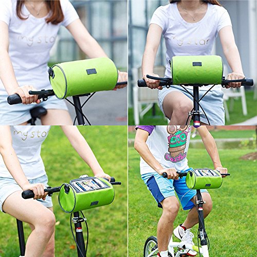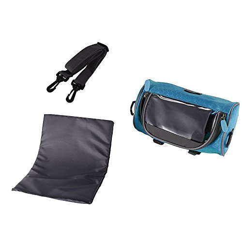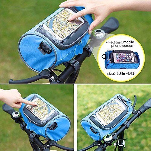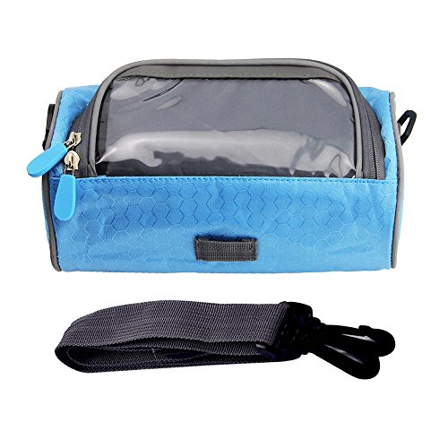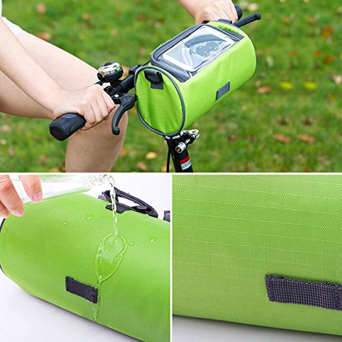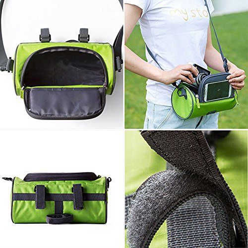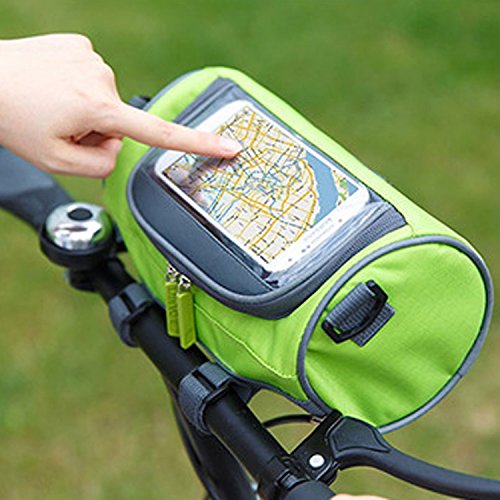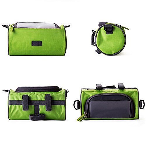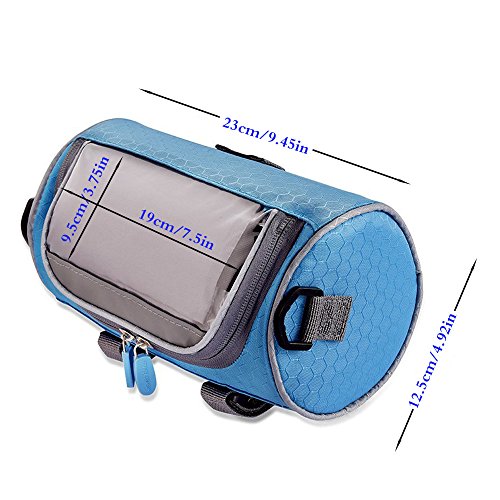 Product Description Feature: Material: Nylon oxford cloth,Transparent PVC window. Bag Size: 23*12.5*12.5cm/ 9*4.9*4.9inch. Widow size: 16.5*8cm/ 6.5*3.15inch. Weight: 192g/ 0.42LB. Colour: Blue and Green. Perfect bike handlebar bag makes your bike rides easier: Multifunction: Professional design, 3 function all in one, can be use as a phone holder, Handlebar Bag and Shoulder bag. Waterproof: Made from waterproof nylon transparent PVC, no need worry raining when cycling. Nice and smooth zip : Easy to insert and take out the phone, large capacity well organize your phone, wallet, keys, snacks, mp3 player, glasses, tools, gloves and much more. Three Velcro straps: Very strong, tight and adjustable, Easy and convenient to adjust and install and detaches from your bike. Can secures your phone right on top and any angle you desire, so you can glance down at it easily.? Small And lightweight: Convenient to carry. Clear transparent highly sensitive window: Very easy to activate the phone touch screen and operate any APP; the touch screen works very great. Package Including: 1* handlebar bag 1* adjustable strap 1* shockproof cushion