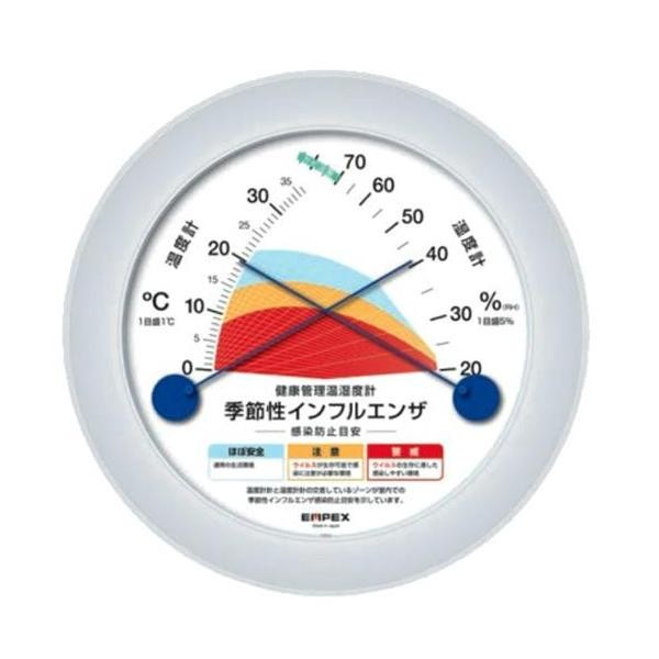 季節性インフルエンザの感染リスクを赤青黄の3段階で表示する、感染防止目安温湿度計。温度計針と湿度計針の交差するゾーンが室内でのインフルエンザ感染防止目安を示しており、加湿器や暖房器具などの設定を調節する事で感染のリスクを低減することが出来ます。 |