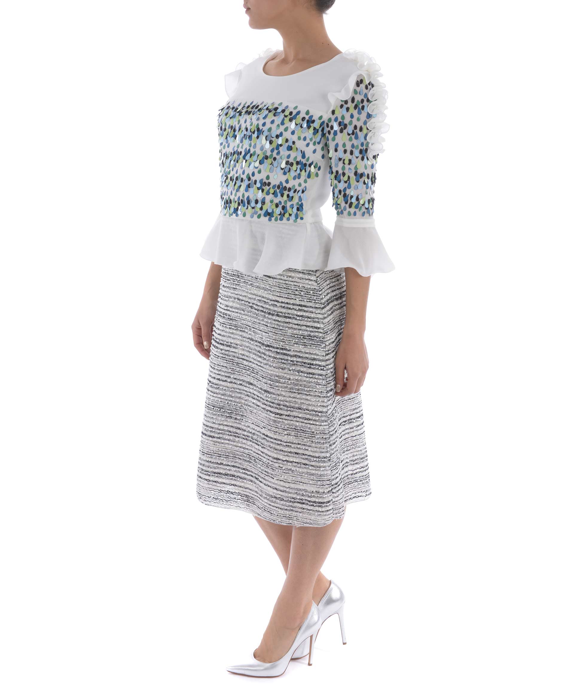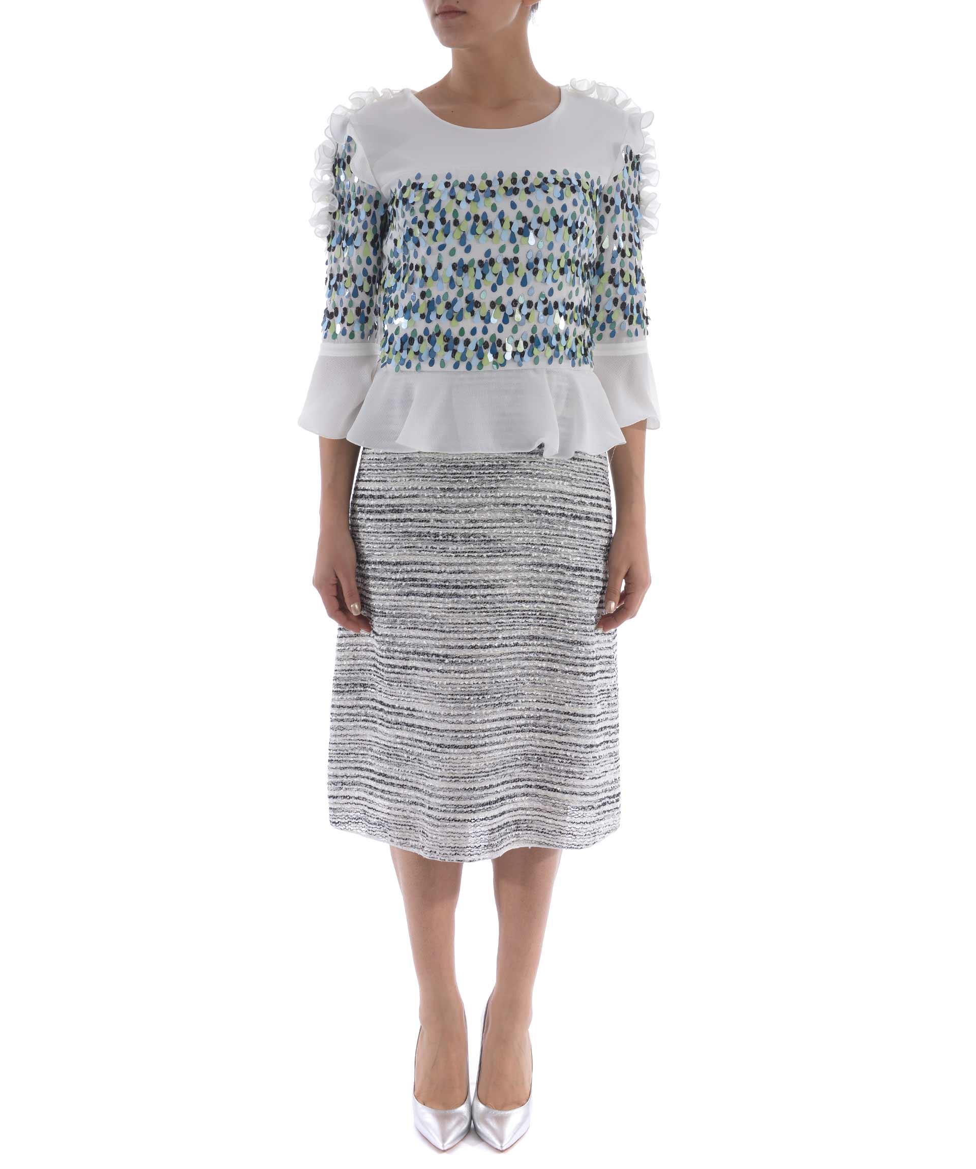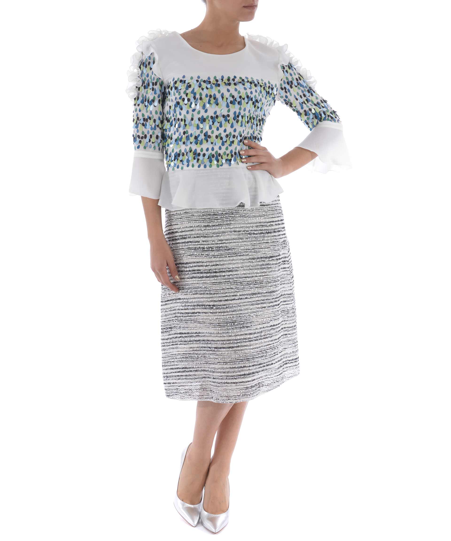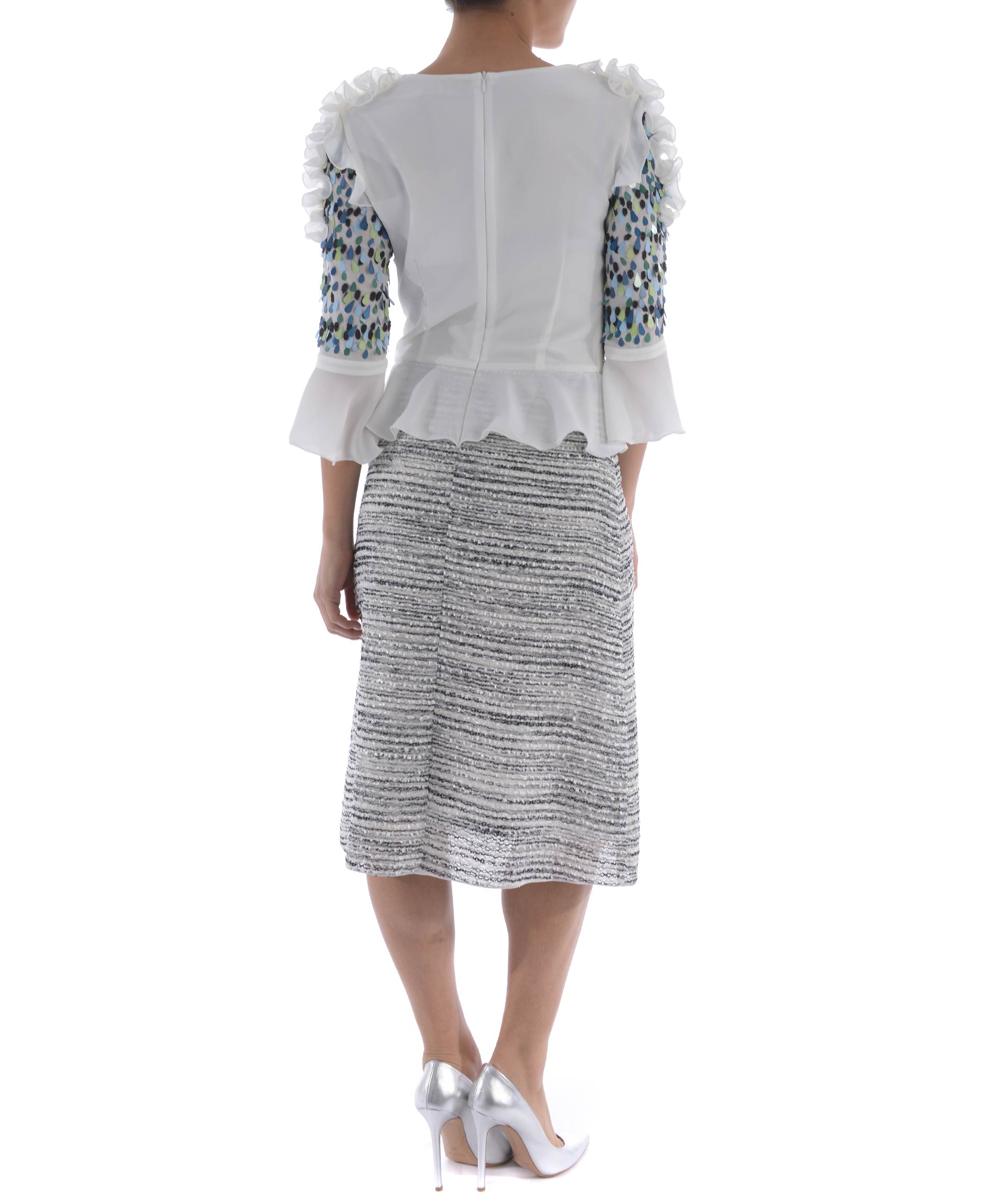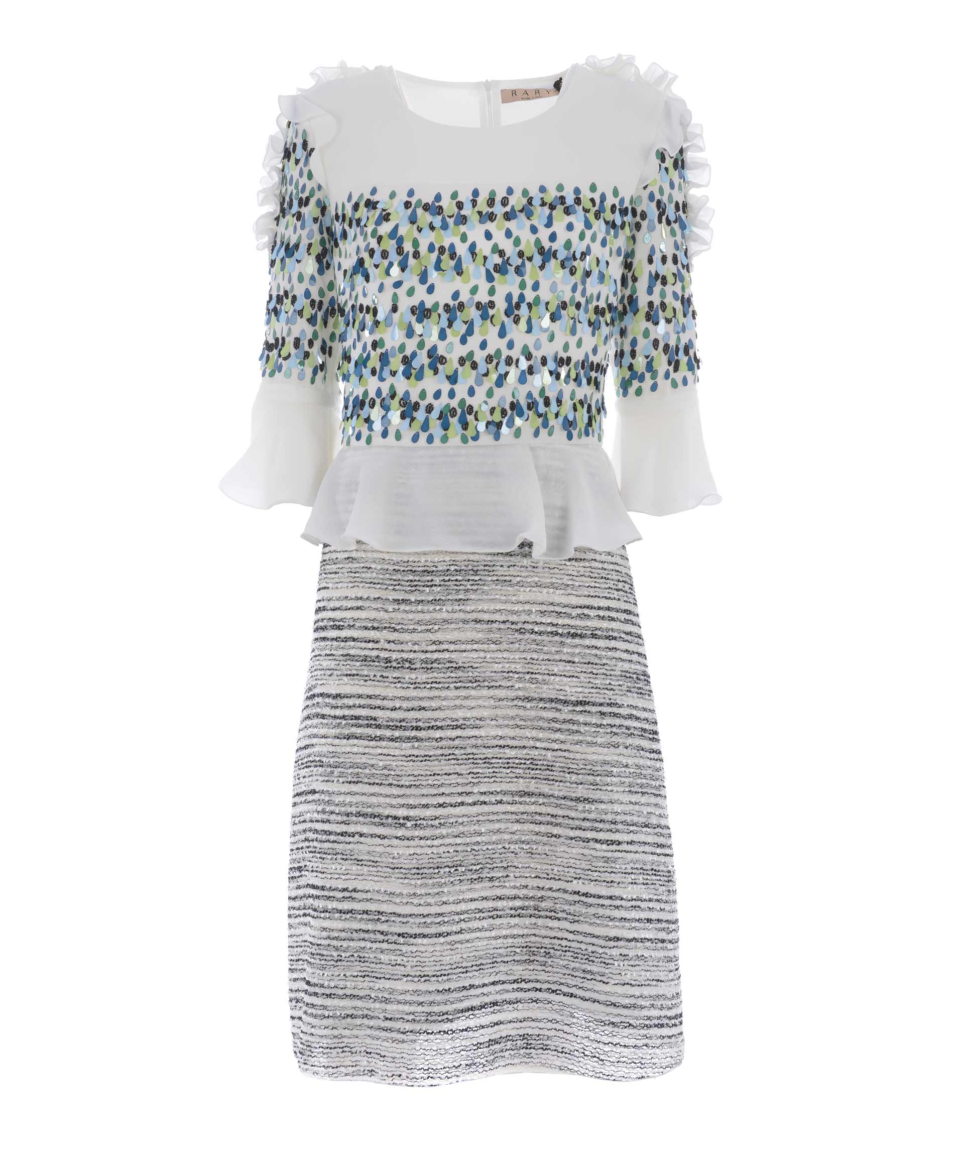 Abito longuette Rary in crepe Bianco e tessuto effetto bouclè Bianco/Nero. Decoro di paillettes e corallini colorati sul pannello frontale e sulle maniche. Ruches al punto vita e sulle spalle. Girocollo. Manica 3/4 con ruches. Chiusura sul retro con zip. Foderato.