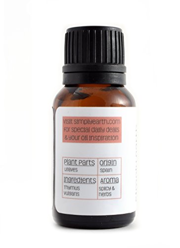 -. Feature : Thyme (red) Essential Oil - 100% Pure - Non-Toxic - No Additives - Unfiltered and Undiluted with No Fillers. / Botanical Name: Thymus vulgaris | Aroma: Sharp, herbaceous, spicy | Origin: Spain | Plant Part: Leaves and stems / Packaged in the USA in 15ml amber glass bottles, 50% more than standard 10ml bottles. Euro dropper cap included. / Simply Earth is a small, eco-friendly, purpose-driven, family company. / 100% satisfied or your money back. We stand behind our products.