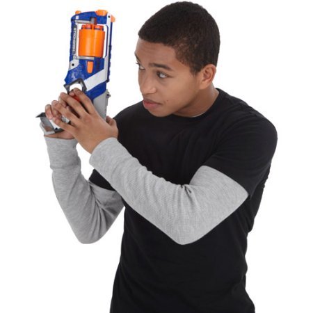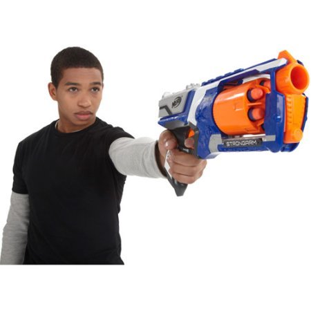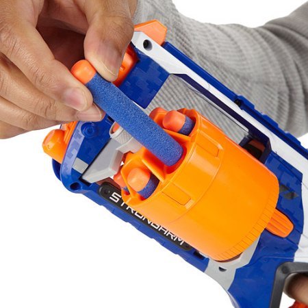 -. Binding : Toy -. Brand : Ner -. EAN : 0634154346631 -. Feature : Holds 6 Elite Darts / Fires darts up to 75', Includes 6 Elite Darts / Pump the Slam Fire repeatedly while you hold down the trigger for rapid firing / Flip open the rotating barrel for easy loading, Compatible with tactical rail accessories / Elite Darts work with any Elite blaster and most N-Strike blasters (sold separately) -. IsAdultProduct : 0 -. Label : Nerf -. Manufacturer : Nerf -. ProductGroup : Toy -. ProductTypeName : TOYS_AND_GAMES -. Publisher : Nerf -. Studio : Nerf -. Title : Nerf N-Strike Elite Strongarm Blaster -. UPC : 634154346631