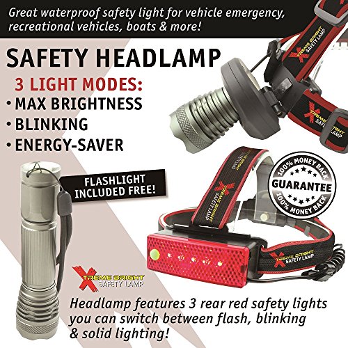 - Feature : LED flashlight is zoomable & has 3 light modes upfront: max brightness, blinking & energy-saver / Headlamp features 3 rear red safety lights you can switch between flash, blinking & solid lighting / Detach front of headlamp, twist it onto base for powerful flashlight when camping, hiking or fishing / Perfect, waterproof safety light for emergency vehicle, bike helmet, recreational vehicles & boats / Our brightest flashlight/nightlight combination comes with a 100% Money-Back Satisfaction Guarantee