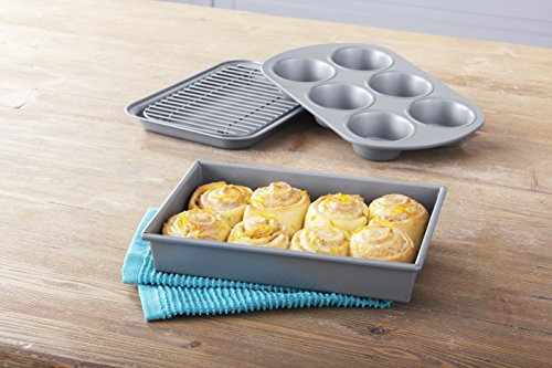 This 4-piece set includes a 9.5 by 6.25-inch baking pan, 9.25 by 6-inch cooling rack, 11 by 7-inch roast/cake pan and an 11.5 by 7.3-inch, 6-cup muffin pan