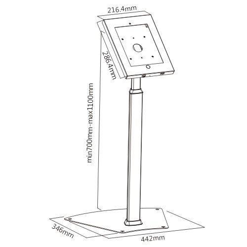 -. Feature : PUBLIC ACCESS. This floor-standing mount was built with the public eye in mind, but it also very accommodating for home or personal use. The floor stand can rotate your screen or tilt it for easy use and this stand comes with a specialized holder for books, magazines, catalogues, brochures, etc. Ideal for businesses, retail, kiosks, stores, schools, government buildings, malls, hospitals, schools, offices, and even kitchens / PIVOTING MOTION. Three separate ranges of movement exist for the iPad tablet holder. Rotate your screen 90 degrees for a portrait or landscape mode. You can also tilt the screen back from a vertical position to a 85 degree horizontal position. The brochure stand has an adjustable height for maximum optimal adaptations. It can also be removed if you do not need it / SECURE LOCKING. A lock and key come with the case holder. The design hides the lock from plain sight to remain elegant and minimalist, but the lock is secure to hold any iPad or tablet in place. The base plate can be removed so a bracket can be screwed or bolted into the ground for added security and stability / COMPATIBLE. This was designed for iPad 2, 3, 4 and iPad Air with specialized home button and front facing camera holes. However, any screen size near 10.1 inches will look nice when mounted in this display. The inside of the case holder for your display comes with padding on the inside to prevent any damage to your screen or casing. The case holder is also vented to keep your device operating at a safe temperature / CABLE MANAGEMENT. The pole comes with a cable management access port to feed and hide cables from view to keep your space as organized as possible. Made from solid steel aluminum alloy, this stand is sturdy, durable, and lasting. The white color scheme is modern and matches most iPad or tablet products for a contemporary appearance
