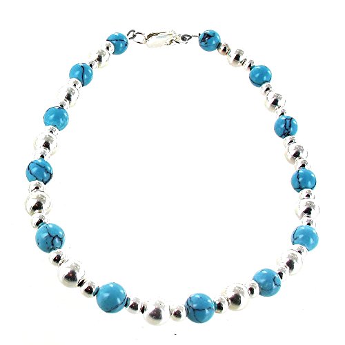 Turquoise Magnesite & Sterling Silver Ladies Beaded Gemstone Anklet w/ Bali Style Daisies, Available Lengths: 9" - 12" (Lobster Clasp, Jump Ring, Crimps & Beads - .925 Sterling Silver) (Daisies Only - Silver Plated Base Metal)Feature