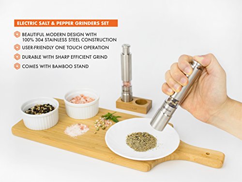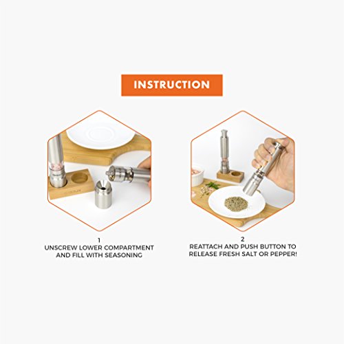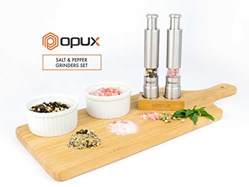 Studio : OPUX Publisher : OPUX Product Description Premium Salt Pepper Grinder Set With Bamboo Stand by OPUX ? This Premium Salt and Pepper Set is made from 100% high-quality 304 stainless steel, giving it a modern/sleek look and higher corrosion resistance than a regular stainless steel Salt and Pepper grinder. ? Single Hand Operation with the one-touch button makes the salt and pepper set both functional and practical. ? Each individual grinder is equipped with our engineered grinding rods (one for salt, one for pepper) to ensure the most efficient grind. ? This grinder set includes an elegant bamboo stand for a more convenient storage. ? Our Premium Salt and Pepper Shakers measure at 6" tall, 1" wide. OPUX creates quality products for your many lifestyles. Our Vision To provide premium kitchen and wine products that greatly simplifies your life. We will continue to innovate and bring exciting products to market so you can achieve more in life! Our Products At OPUX, we offer an extensive line of kitchen tools (such as salt pepper mills), lunch bags, and wine bags/accessories made of highest quality for all occasions. Our products are meticulously designed with materials and functions that truly simplify your life so you can focus on creating your favorite meals or entertaining your guests. 0