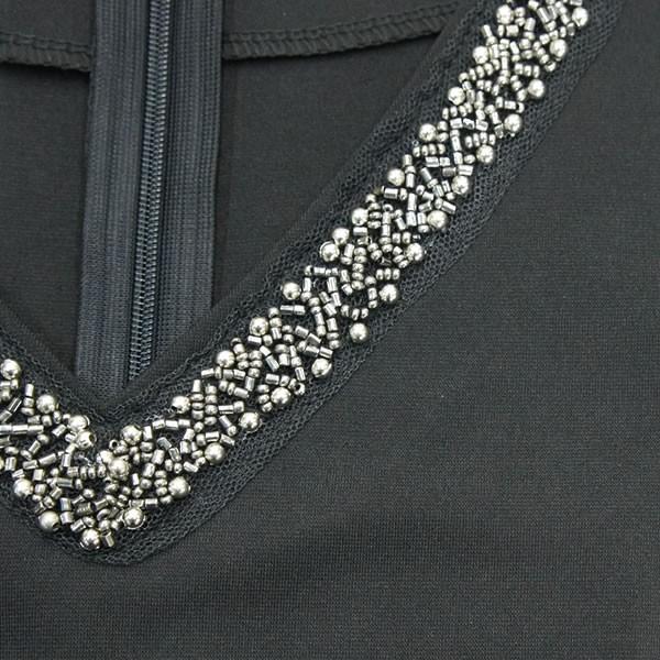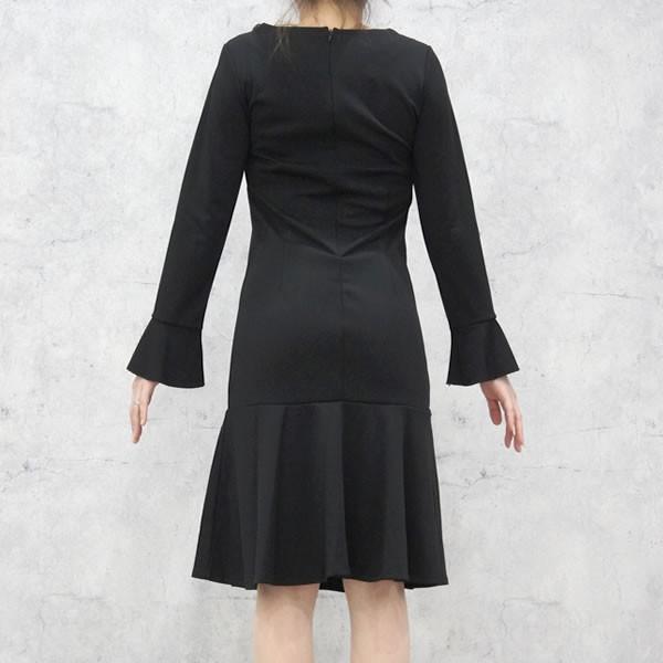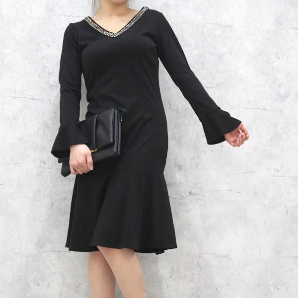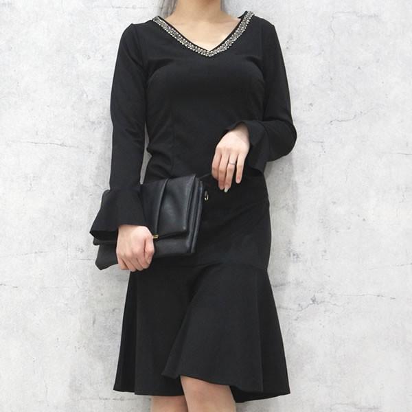 | 商品名:Vネック ビジュー デザイン ワンピース マーメイドライン 長袖 ひざ丈 【ワンピース レディース 女性 黒 ブラック ロンデルブラック モード 体型カバー 膝丈 ワンピース ひざ丈 one-piece】 |