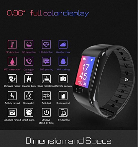 Product Features 1. Blood Oxygen/Blood Pressure Monitor 2. Heart Rate Monitor 3. Date display (12/24-hour clock) 4. Sleep monitoring (Deep sleep & light sleep) 5. Fitness tracking (step& distance Calories) 6. Weather display 7. Call remind (name ID number) 8. Message remind (WeChat/skype/WhatsApp) 9. Sedentary remind 10. Alarm clock 11. Remote camera 12. Anti-lost remind 13. Drinking water remind 14. Lift wrist bright screen Fitness information sharing Product Parameters