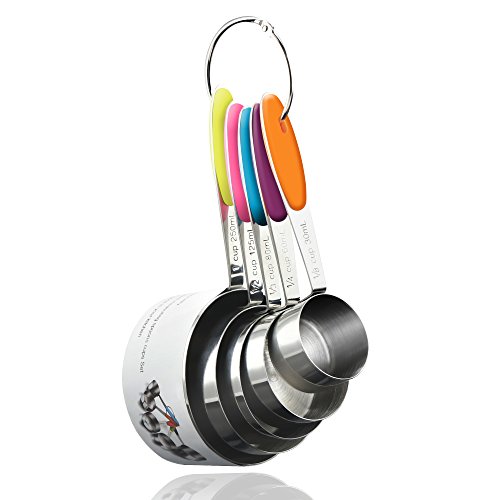 - Brightly colored Measuring cups handle,more beautiful than other average measuring cups and brighten your kitchen.Soft rubber handles provide added user comfort and better grip.Engraved measurement markings on the handle. Soft detachable silicone handles.The ring organizer to hold the spoons together.
