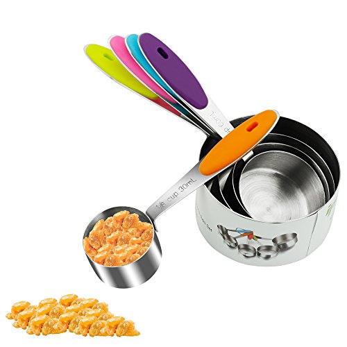 - Durable & accurate stainless steel measuring spoons cups Set includes 5 different sizes : 1/8 cup 30ml, 1/4 cup 60ml, 1/3 cup 80ml, 1/2 cup 125ml and 1 cup 250ml,great for most basic recipes,any soft, liquid or seasoning cooking ingredients including Flour, Honey, Canola Oil, Olive oil, Vinegar, Mustard, Ground cumin, Chili powder, Dried oregano, Salt, Ground black pepper and many more.