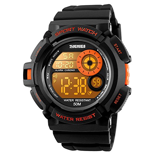 -. Feature : Fashionable, very charming for all occasions. Amazing looking watch, a great gift for family and friends. Suitable for unisex adults, teens / The watch is surprisingly light for its size, imported PU watch band feels comfortable. Simple and durable structure, it is very easy to setup, quick to setup. Imported IC Chip set provides precise and accurate time keeping. Numbers are large and easy to read / 7 color bright LED back lights (long press top left button to change) makes time reading super easy and fun, you can select what color you want the back light to be or you can have it go through all of them like a little light show on your wrist / Multi-function: 24H time mode, Calendar Day and Date, Week, Alarm, Stop Watch, LED Back Light, Shock Resistant, Water Resistant / 164 FT / 50 M waterproof, perfect for both indoor and outdoor activities. Such as running, climbing, swimming, fishing, skiing, paddle boat, etc. NOTE: please DO NOT press any buttons in the water and keep it away hot water