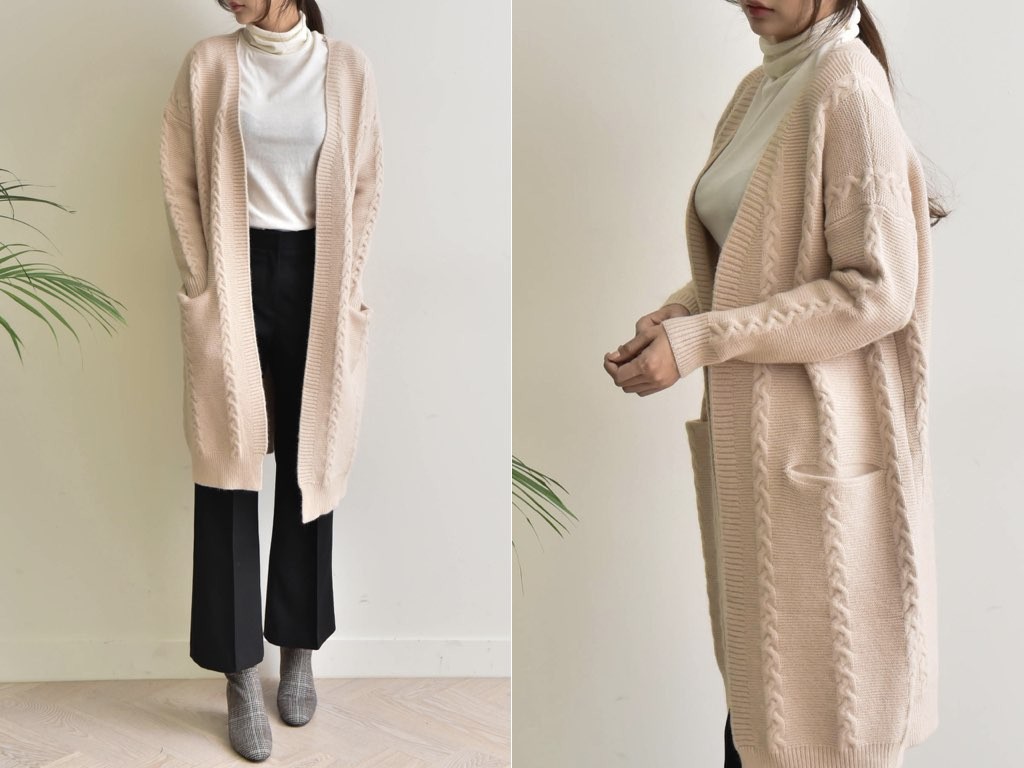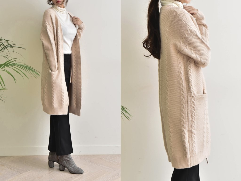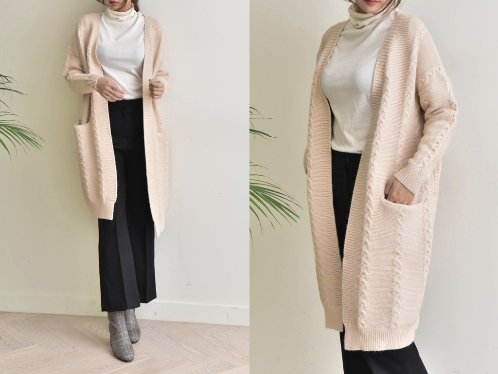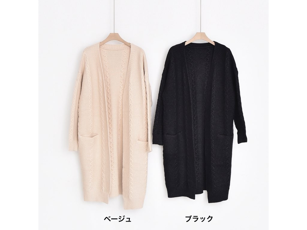 ロング丈のカーディガンです。シンプルでスタイリングの軸となるカーディガンです。オフィススタイルでも、休日スタイルでも幅広く着用できてオシャレの核となるデザイン。1.基本情報色:2色展開(ブラック/ベージュ)サイズ:Free素材:アクリル混紡製造国:korea2.サイズ情報肩幅:60cm 身幅(胸断面):56cm 腕の長さ:42cm 着丈(前):92cm (サイズは計る方法に応じて±2〜3cmの誤差があります。ご了承お願い致します)モデル着用サイズ:F※着用モデル(163cm、体重47kg、足のサイズ24.5cm)3.その他の情報厚み:中間透け感:なし伸縮性:中間裏地:なし洗濯方法:ドライ(クリーニング)[注意事項]お取り寄せ商品は、海外より仕入れるため納品まで約10日前後いただきます。また店舗でも販売しており、在庫切れになる場合もございます。ご了承お願い致します。