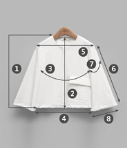 | 尺码 | ①前衣长 | ②后中长 | ③胸围 | ④下摆围 | ⑤肩宽 | ⑥袖长 | ⑦袖臂围 | ⑧袖口围 | ||