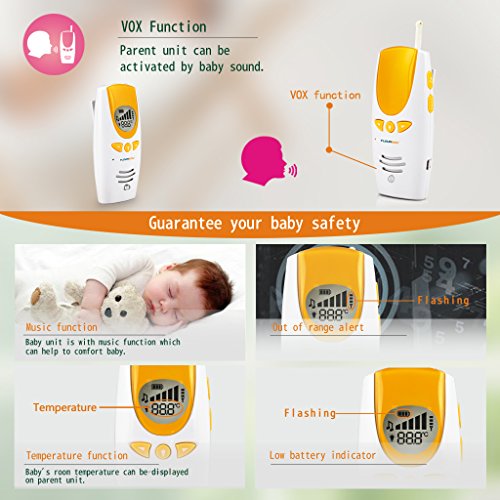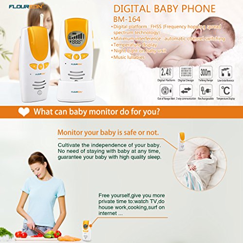 Features: 2.4 GHz digital Music lullabies Temperature display Low battery indicator Signal strength display Night Light on baby unit Rechargeable (Parent Unit) Two way communication Automatic channel switching Communication range: 984fts (300m) Digital platform: FHSS (FHSS: Frequency Hopping Spread Spectrum Technology)