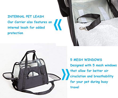 Comfortable VIP Style Mesh ventilation on four sides not only provides adequate airflow, but also easy viewing--perfect for your furry friend to look out and for you to check on your pet. Our pet carrier comes with a removable base insert,which creates a solid surface for your pet to stand on, along with a removable fleece pet bed,which offers a cozy sleeping space for your traveling pet.