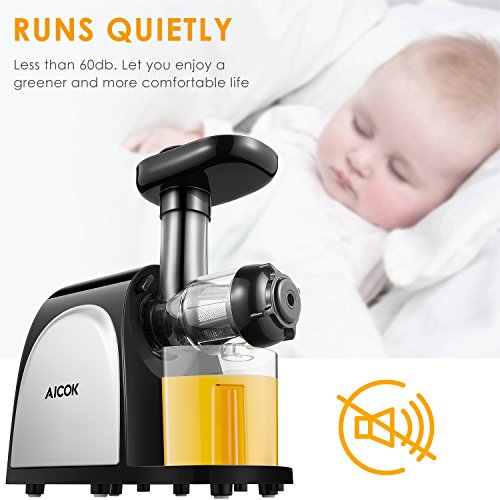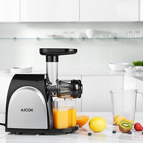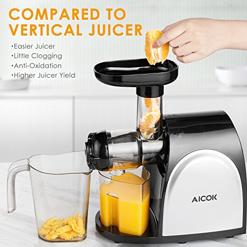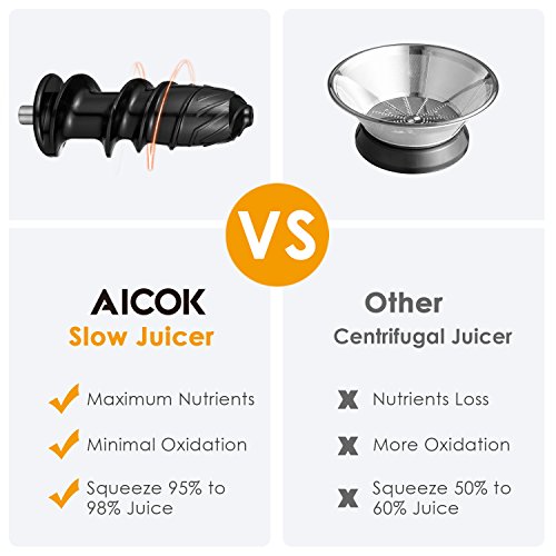 Aicok Masticating Juicer uses an auger to squeeze out juice instead of shredding fruits and vegetables with high-speed blades like cheaper centrifugal juicers. This natural motion minimizes damage to ingredients, keeping natural taste and nutrition intact. Juicer Features: Slow, powerful extraction for optimum nutrition with minimal oxidation, preserving natural taste & nutrients.