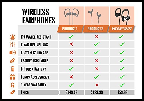 -. Feature : CUSTOM EQ APP - Through our Veosport EQ app you can adjust the sound settings of your V1 earphones. Add extra bass, treble, or create a custom sound! / 8 EAR TIP OPTIONS - Find a secure fit with 8 options to choose from including comply foam (S,M,L), silicone (S,M,L), and triple flange (M,L). / IPX7 SWEATPROOF - Bring on the sweat! The V1's are design to take on your most intense workouts! / 8 HOUR BATTERY LIFE - Enough battery life to get you through a weeks worth of workouts. / ACCESSORIES INCLUDED: 8 ear tips, cable clip, cable shortener, carrying case, cloth bag, braided micro usb cable, and the user manual.