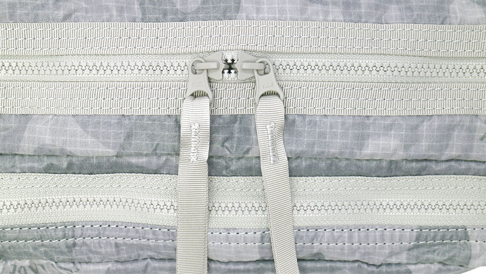 In order to cope with highly flexible main body fabric, YKK Bismlon fastener made of resin instead of metal fastener is adopted. The lightweight slider makes smooth movements and places no burden on surrounding fabrics during opening and closing.