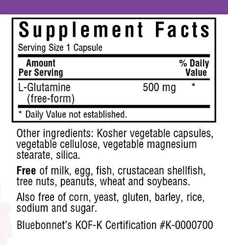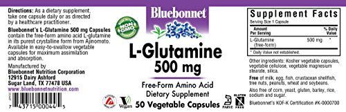 Bluebonnet's L-Glutamine 500 mg capsules provide pharmaceutical grade free-form amino acid L-glutamine in its purest crystalline form. Available in easy-to-swallow vegetable capsules for maximum assimilation and absorption.Feature